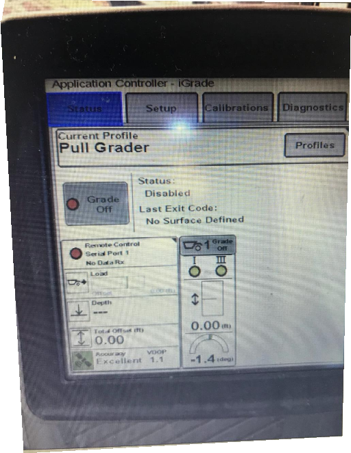 iGrade is not receiving messages from T3RRA Cutta, therefore “No Surface Defined” will be displayed and iGrade will not let the user turn “Grade On”