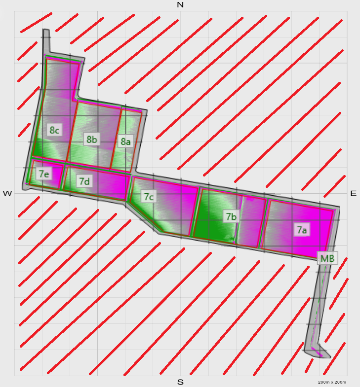 In-Cab software automatically orientates to the north, and is recorded as a square. If the surveyed field is at an angle to north it will be save additional data as invisible points to fill empty space, shown in the red hatched section of the below image.