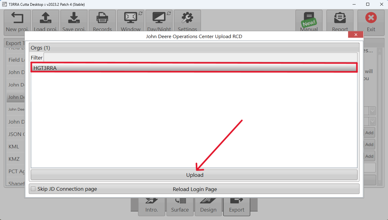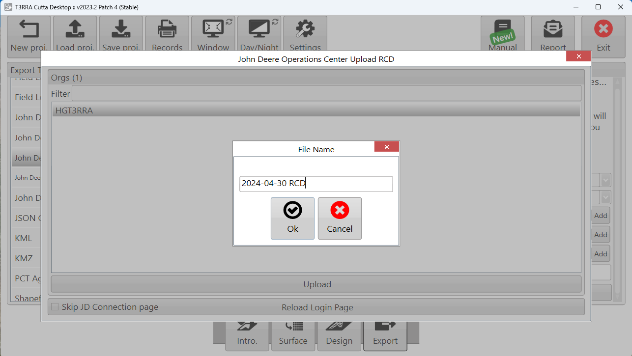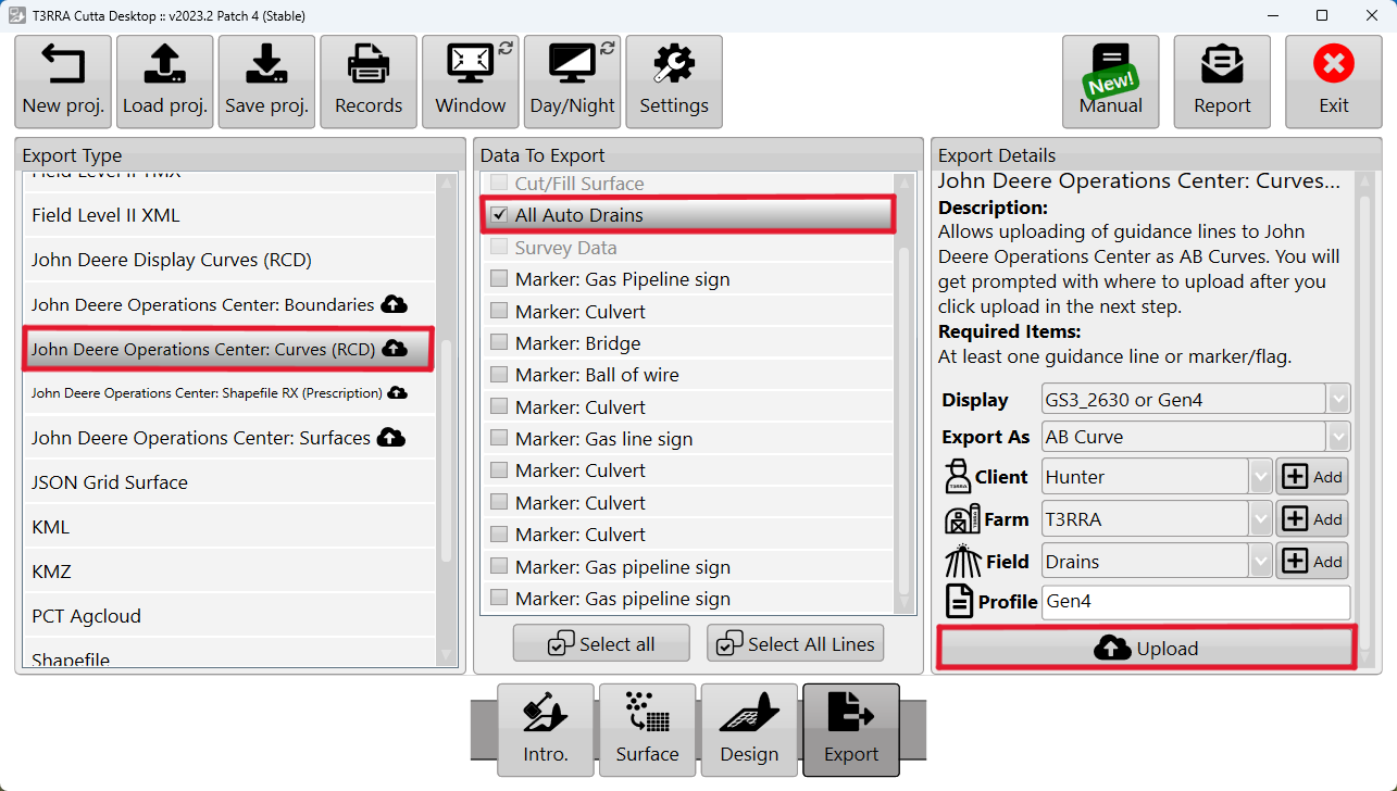 Choose "John Deere Operations Center: Curves (RCD)", choose the linework, enter your Export Details, and select Upload. If this is the first time you have attempted to transfer files to Ops Center, you will be prompted to sign in to your MyJohnDeere account.